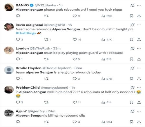 质疑NBA的球迷也有:1.NBA这是被操纵了吗?一个中锋打了半场没有篮板球?