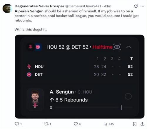 北京时间1月24日,火箭以111-104复仇活塞。这场比赛火箭队的先发中锋阿尔佩伦-申京延续了他对阵费城的低迷状态,此役他的拉胯更盛,火箭球迷们对他已经忍无可忍在社媒上各种炮轰,全都是因为申京作为一名6尺11(2.11米)的中锋只有1个篮板。